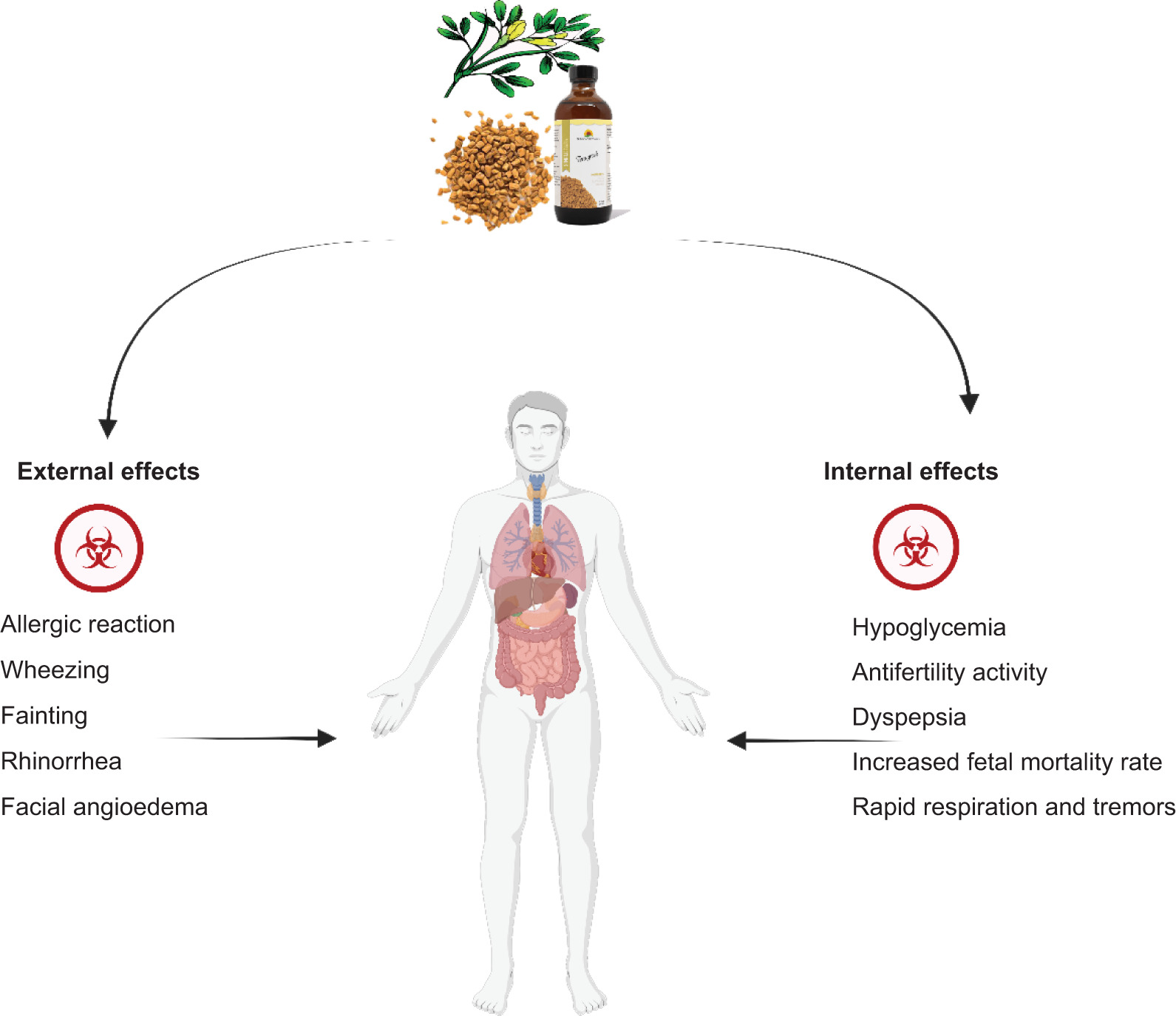 Figure 3. Fenugreek, a double-edge sword: external (e.g., skin reactions) and internal (e.g., digestive issues) adverse effects.