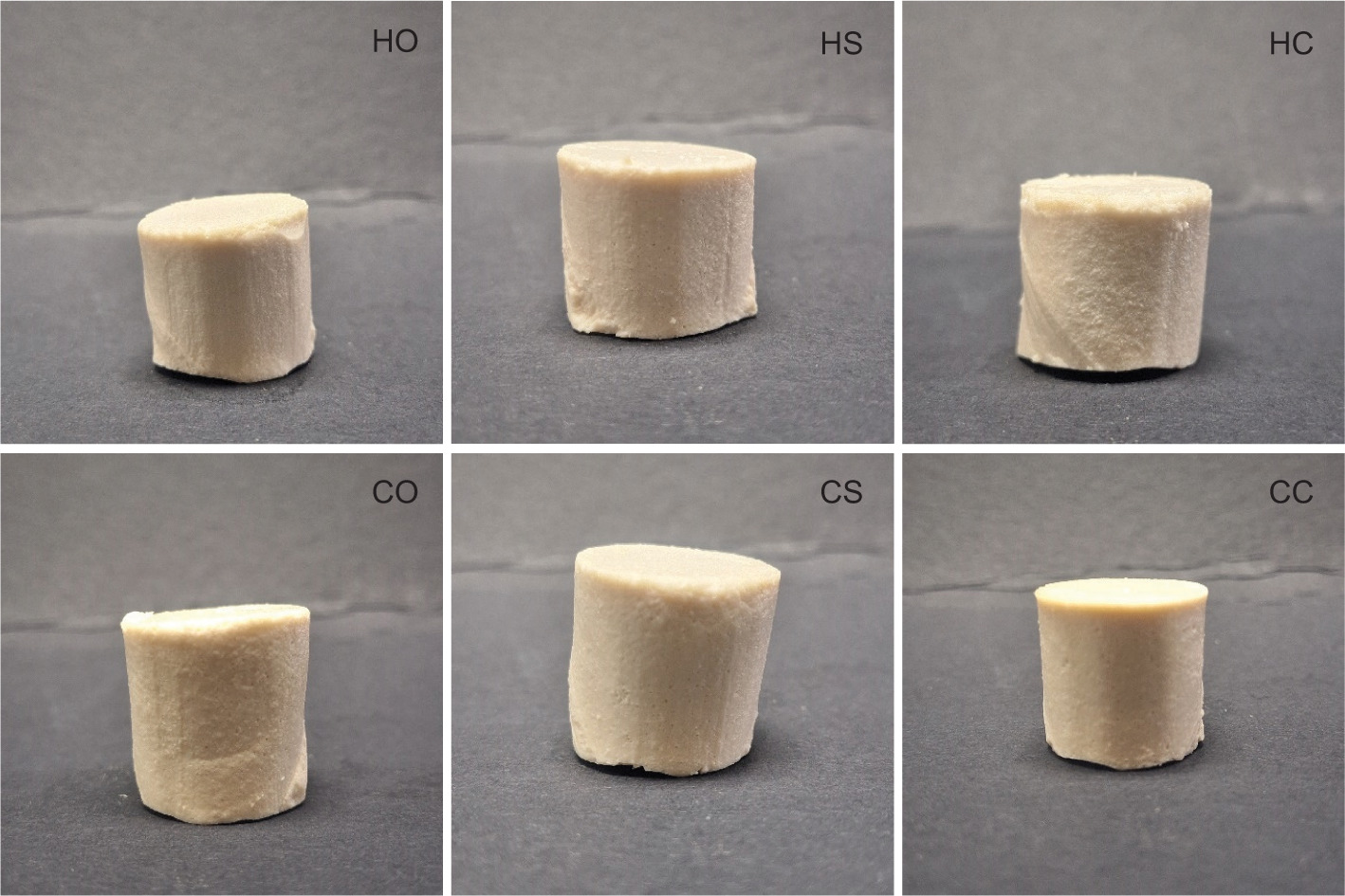 Figure 1. Pea protein emulsion gel (PPEG) prepared using the hot and cold gelation technique with various oil types (olive oil, sunflower oil, and canola oil). HO: hot gelation-olive oil; HS: hot gelation-sunflower oil; HC: hot gelation-canola oil; CO: cold gelation-olive oil; CS: cold gelation-sunflower oil; CC: cold gelation-canola oil.