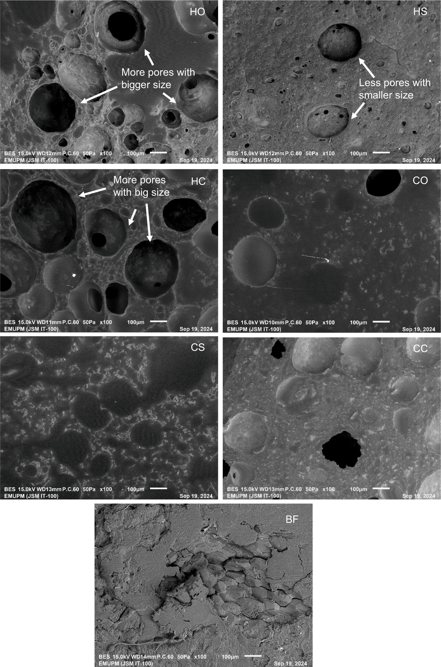 Figure 3. Microstructure of PPEG prepared using hot and cold gelation techniques with various oil types (olive oil, sunflower oil, and canola oil) and beef fat. HO: hot gelation-olive oil; HS: hot gelation-sunflower oil; HC: hot gelation-canola oil; CO: cold gelation-olive oil; CS: cold gelation-sunflower oil; CC: cold gelation-canola oil; BF: beef fat. Magnification 100×.
