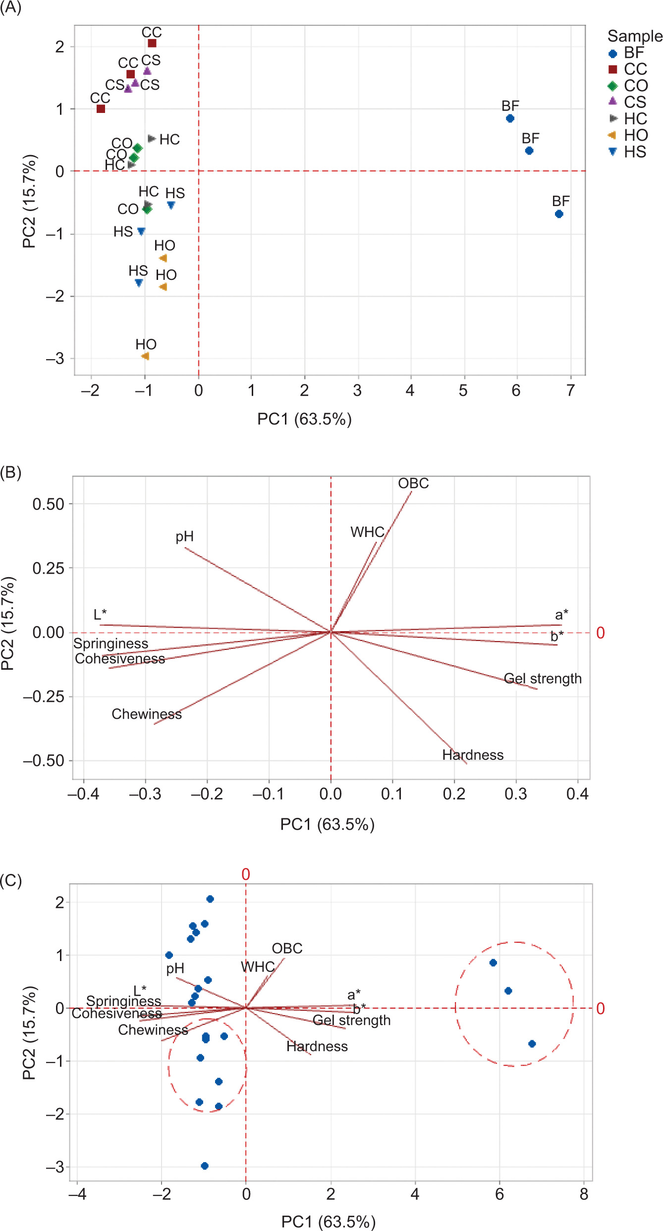 Figure 4. (A) Score plot, (B) loading plot, and (C) biplot of principal component analysis based on the effect of oil type and gelation technique on PPEG characteristics. HO: hot gelation-olive oil; HS: hot gelation-sunflower oil; HC: hot gelation-canola oil; CO: cold gelation-olive oil; CS: cold gelation-sunflower oil; CC: cold gelation-canola oil; BF: beef fat.