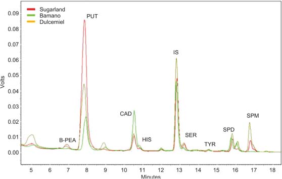Figure 2. Chromatographic profiles of biogenic amines determined in tomato samples: Sugarland (red trace), Bamano (green trace), and Dulcemiel (dark yellow trace). β-PEA: β-phenylethylamine; PUT: putrescine; CAD: cadaverine; HIS: histamine; IS: internal standard; SER: serotonin; TYR: tyramine; SPD: spermidine; and SPM: spermine.