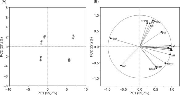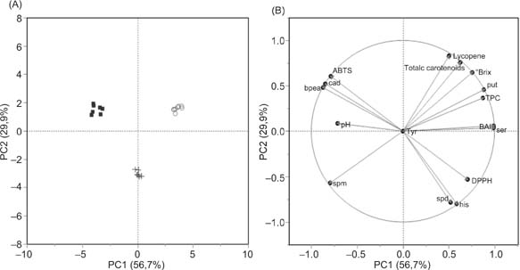 The loadings’ plot pointed out for Dulcemiel samples was positively correlated with DPPH, SPD, and HIS variables. It is clear in Tables 2 and 3 that Dulcemiel cultivar had the highest content in these compounds. Sugarland demonstrated a positive correlation with SER, BAI, PUT, TPC, SSC, total carotenoids, and lycopene. Moreover, Sugarland had a high negative correlation with SPM. Samples of the Bamano cultivar were positively correlated with CAD, β-PEA, pH, and ABTS content. Therefore, results of the PC explorative analysis were in accordance with the experimental ones (Guerreiro et al., 2013).
