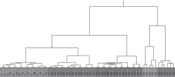 Figure 5. Cluster analysis: Sugarland (samples 1–16), Dulcemiel (samples 17–32), Bamano (samples 33–48), control fresh (samples 49–53), and control canning (samples 54–59).