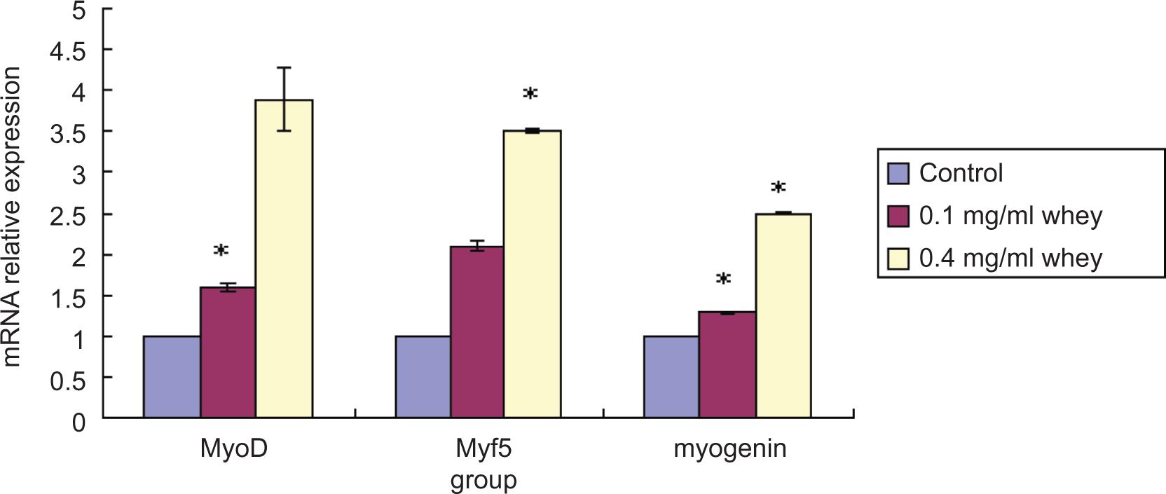 Since the activation of MRFs is a prerequisite for myogenesis, we investigated the effect of whey protein on the expression of MyoD, myogenin, and Myf-5. C2C12 myoblasts were incubated in DM alone or with 0.1 and 0.4 mg/ml whey protein. The expression of MyoD, myogenin, and Myf-5 mRNA was measured using QRT-PCR. As shown in Figure 1, whey protein increased the expression of MyoD, Myf5, and Myogenin in C2C12 myoblasts. The mRNA levels of these genes were significantly higher in the experimental group as compared with the control group. These data suggest that whey protein regulates myogenic differentiation by influencing the MRF transcript levels.
