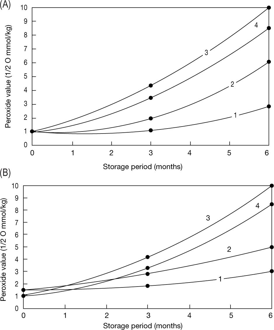Figure 3. Peroxide values of (A) blend No. 5, and (B) blend No. 6. Note: Curves 3 and 4 reflect the values obtained for the control sample. Curves 1 and 2 correspond to the experimental blends stored at 10°C and 20°C, respectively.