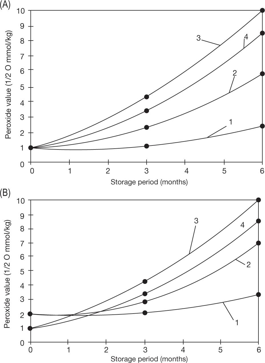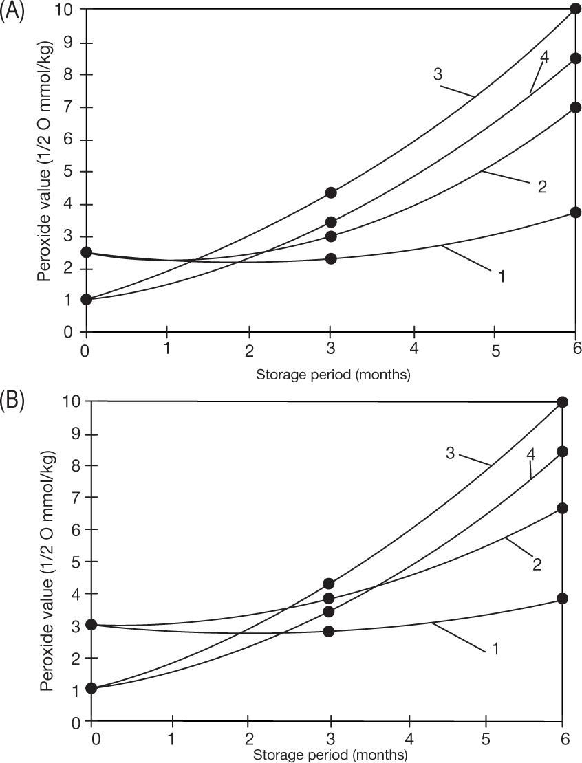 Figure 1. Peroxide values of (A) blend No. 1, and (B) blend No. 2. Note: Curves 3 and 4 reflect the values obtained for the control sample. Curves 1 and 2 correspond to the experimental blends stored at 10°C and 20°C, respectively.