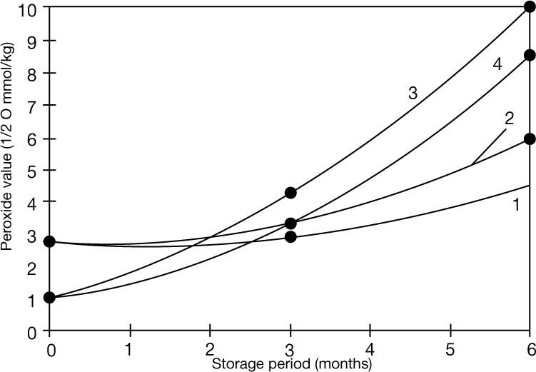Figure 5. Peroxide value of blend No. 9. Note: Curves 3 and 4 reflect the values obtained for the control sample. Curves 1 and 2 correspond to the experimental blend stored at 10°C and 20°C, respectively.