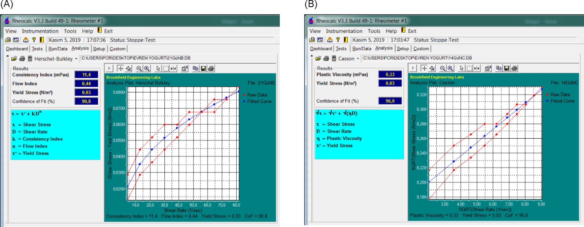 Figure 1. Examples of the plots of rheological model fits for yogurts by Rheocalc v3.3 software at 20°C added with (A) Herschel–Bulkley model fit for 1% MP-added yoghurt on 21st day and (B) Casson model fit for 2% MP-added yoghurt on 14th day.