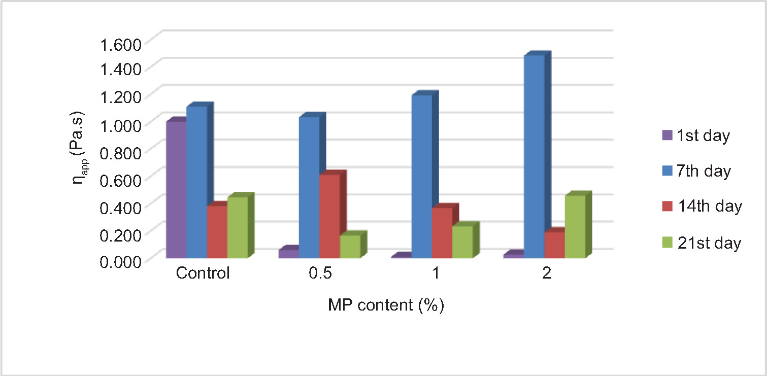 Table 2. Flow behavior of control and MP-added yoghurt samples predicted by Power Law, Herschel–Bulkley, and Casson models during the 21 days of cold storage.