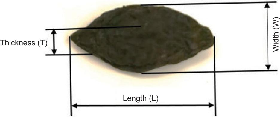 Randomly selected 30 samples of T. chebula dried fruit were used. Dimensions of dried fruit were measured with a digital caliper with an accuracy of 0.01 mm (Mitutoyo, Absolute Digimatic, Japan) (Figure 2).