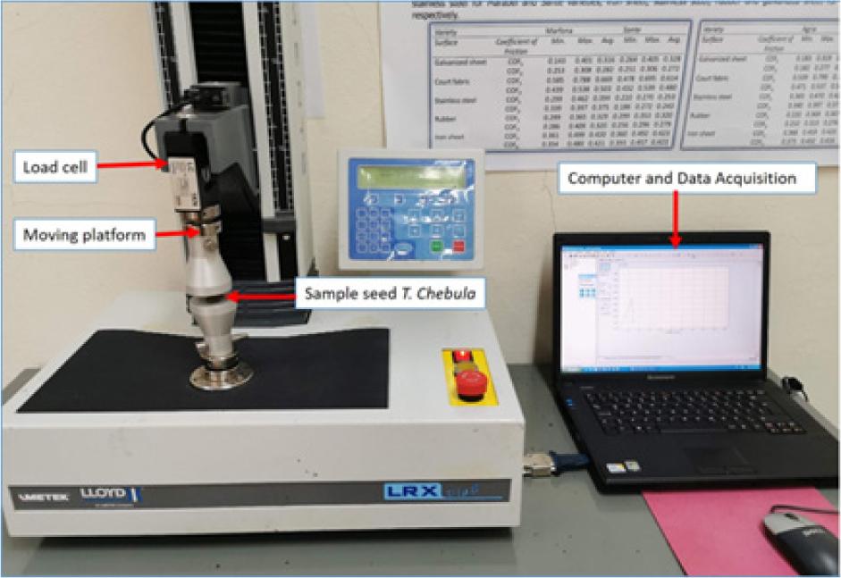 For T. chebula dried fruit, this was determined by connecting a wooden box to the load cell of the universal tester. The wooden box (60 × 120 × 100 mm) had an opening at the bottom and was connected to the load cell (Lloyd Biologicals Tester; Figure 4) with a pulley mechanism. The test was carried out by moving the box filled with dried fruit horizontally at a speed of 100 mm/min so that the contents were in contact with the friction surface.