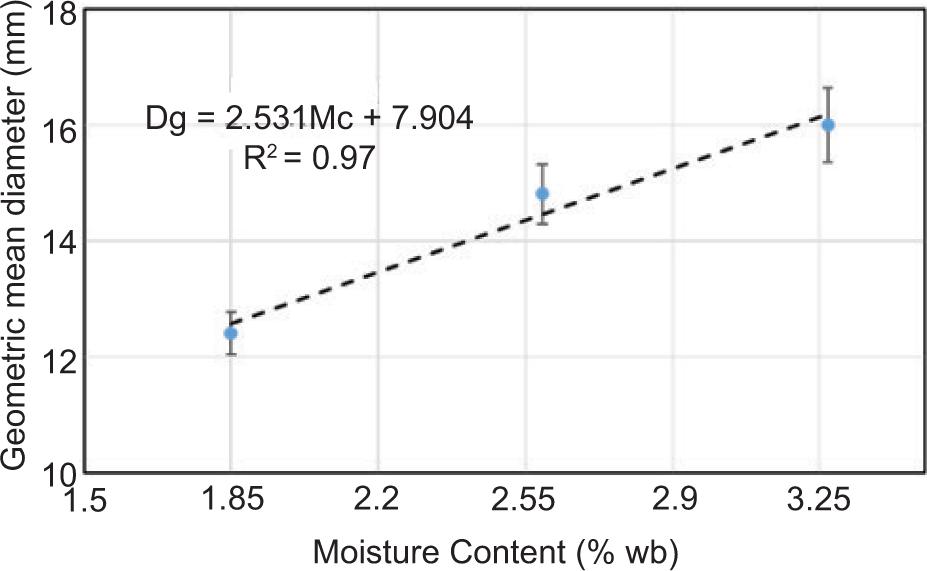 Figure 7. Effect of moisture content on the geometric mean diameter of T. chebula dried fruit.