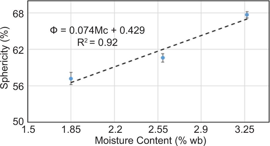 Trends similar to the effect of moisture content on the sphericity of T. chebula dried fruit were reported by Vashishth et al. (2020) for horse gram, Gharibaahedi et al. (2010) for black cumin seed, Su et al. (2021) for maize kernel, and Yurtlu et al. (2010) for laurel seed.