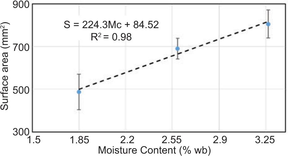 In the study, the moisture content of T. chebula dried fruit increased from 1.85% to 3.27% and the surface area increased from 487.65 mm2 to 805.03 mm2. Figure 9 shows the linear relationship between moisture content and surface area and the regression equation of relationship between the moisture content and the surface area of the dried fruit of T. chebula. The surface area was significantly (p ≤ 0.01) affected by the moisture content.