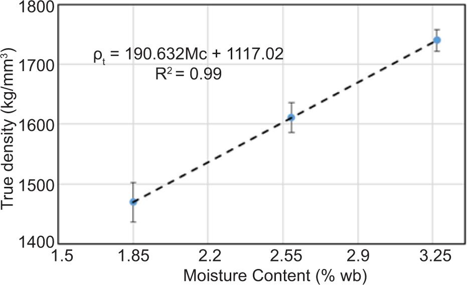 The true density of T. chebula dried fruit increased from 1469.54 kg/m3 to 1740.22 kg/m3 and was significantly (p ≤ 0.01) affected by its moisture content. The relationship between moisture content and true density, and regression equation, is given in Figure 11. The overall increase in the true density of T. chebula dried fruit could be due to the higher increase in weight than fruit volume. The true density results of T. chebula dried fruit agreed with the results of the studies conducted by Singh and Meghwal (2019) for ajwain seed and Bhushan and Raigar (2020) for rice beans.