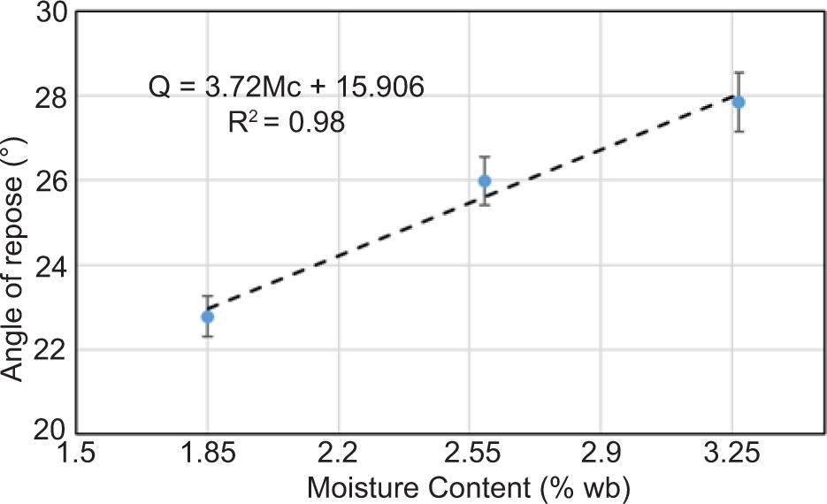 An increase in the natural agglomeration angle of T. chebula dried fruit was observed. The increased moisture of T. chebula dried fruit decreased its flow ability, which increased fruit’s stickiness. The natural agglomeration angle of T. chebula dried fruit increased from 22.77° to 27.86°. The result obtained agreed with the result of the study conducted by Bajpai et al. (2019) for jamun seed (Syzgium cuminii).