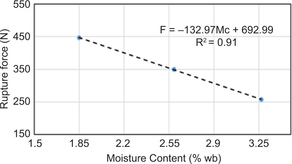 In T. chebula dried fruit, for a moisture content of 1.85%, the minimum rupture force determined was 405.24 N and the maximum was 487.20 N. For a moisture content of 2.59%, the minimum rupture force was 296.79 N and the maximum was 397.72 N. Finally, for a moisture content of 3.27%, the minimum rupture force determined was 214.29 N and the maximum was 309.33 N. One-way ANOVA demonstrated a significant relation between moisture content and rupture force of T. chebula dried fruit (p ≤ 0.01); this along with regression equation is given in Figure 14.
