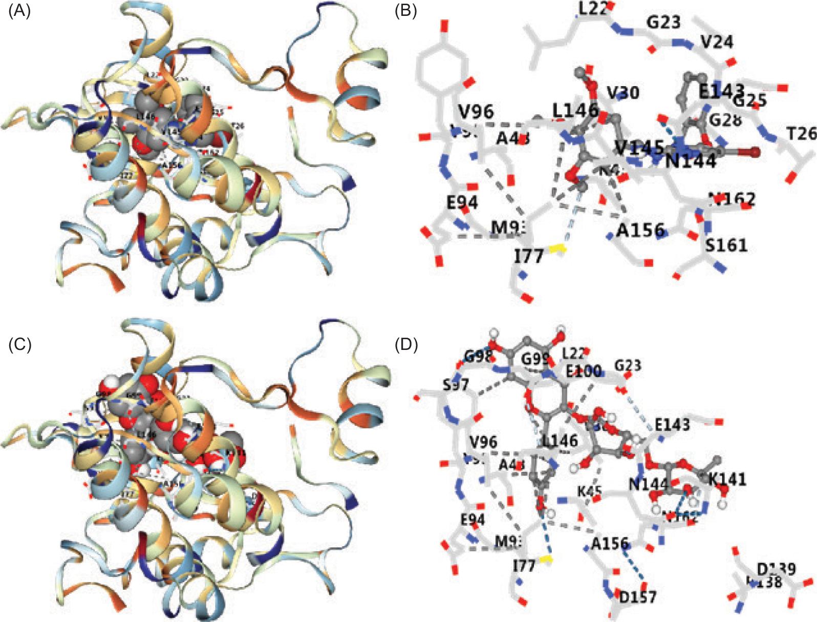 Figure 1. Docking results of SBI-0206965 and KR with AMPK. (A) 3D complex of SBI-0206965–AMPK. (B) Amino acid binding of SBI-0206965–AMPK. (C) 3D complex of KR-AMPK. (D) Amino acid binding of KR to AMPK. KR: kaempferol-3-O-rutinoside.
