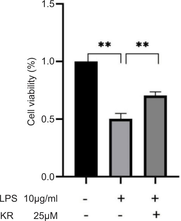 H9c2 cells were cultured with KR at 25 μM for 12 h. CCK8 assay confirmed that KR significantly increased LPS-induced H9c2 cell survival (p < 0.01). KR appreciably increased the growth of H9c2 inhibited by LPS (Figure 2).