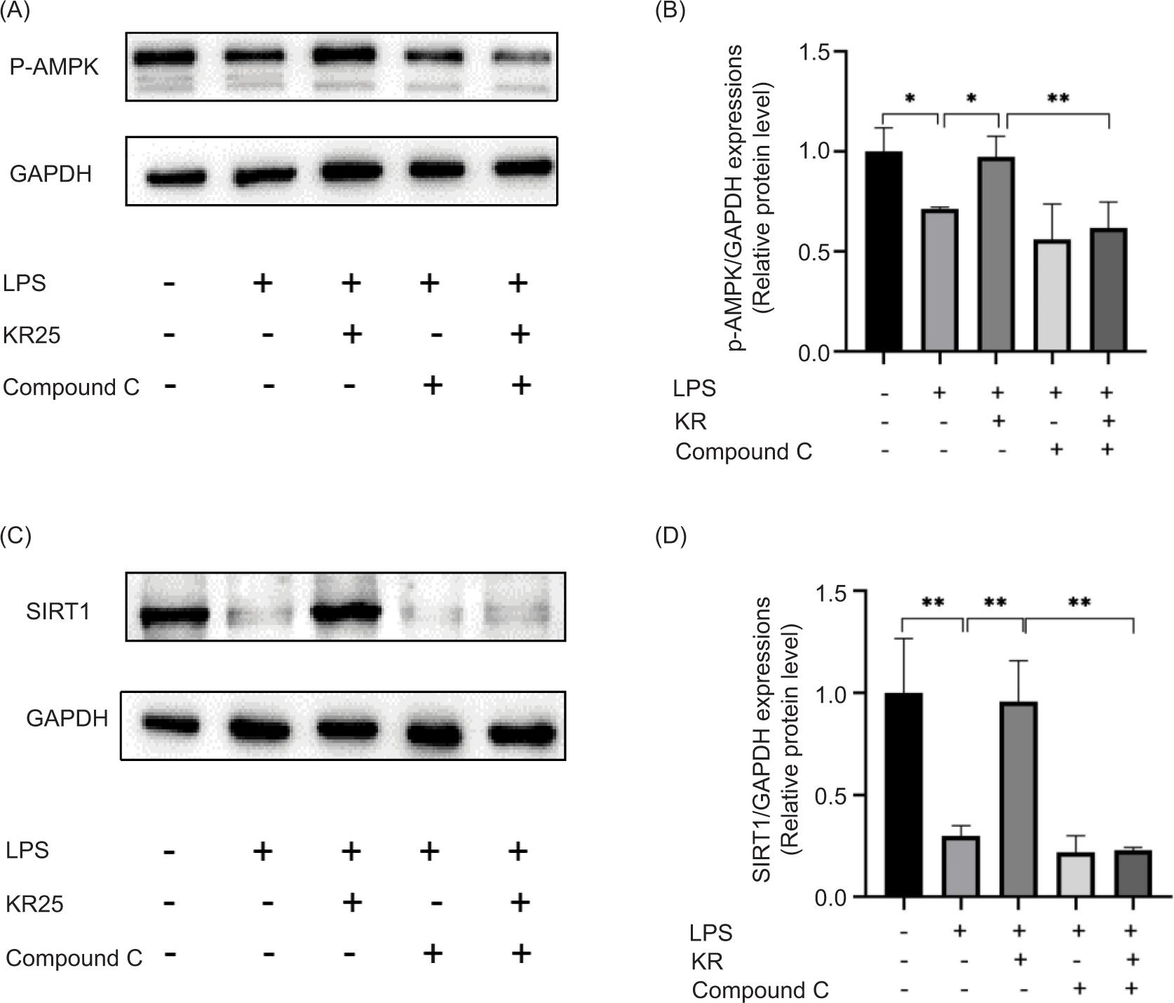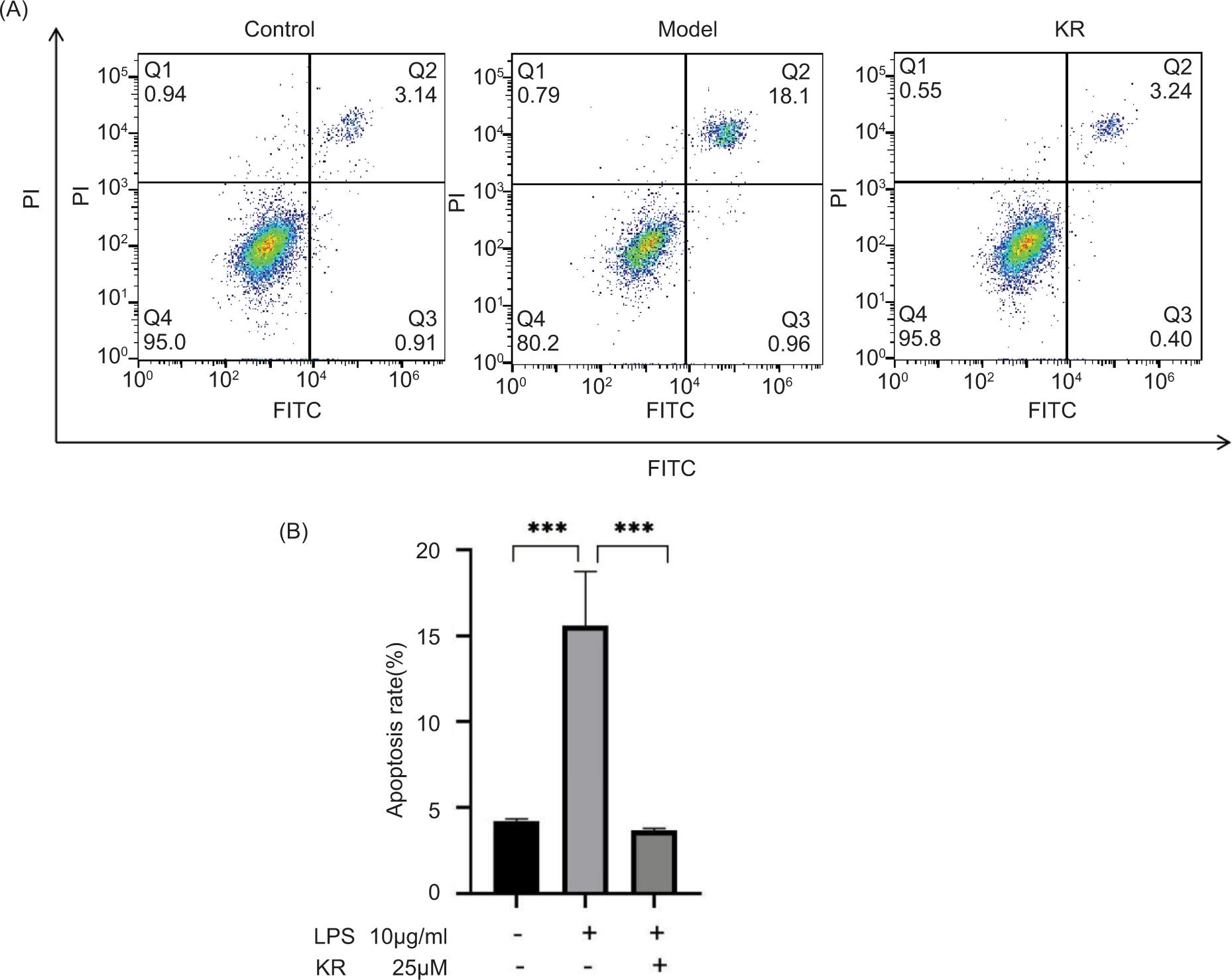 The purity of KR is more than 98% (Desite Biotechnology Co. Ltd., Chengdu, China). AMPK-specific inhibitor (Compound C) was obtained from Abmole Bioscience Inc. (USA). Lipopolysaccharide (LPS, Cat. No. L8880) was obtained from Solarbio Science & Technology Co. Ltd. (Beijing, China). Fetal bovine serum (FBS, BL201A) and Dulbecco’s modified eagle medium (DMEM, BL304A) were purchased from Biosharp (China). Penicillin–streptomycin solution was purchased from Shandong SparkJade Biotechnology Co. Ltd. (China). Mouse tumor necrosis factor-α (TNF-α; MM-0180R1), interlukin (IL)-1β (MM-0047R1), IL-6 (MM-0190R1) and enzyme-linked-immunosorbent serologic assay (ELISA) kits were bought from Meimian (Jiangsu, China). Anti-p-AMPKα (AF3423) and anti-SIRT1 (DF6033) were purchased from Affinity Biosciences (Melbourne, Australia). Anti-glyceraldehyde 3-phosphate dehydrogenase (GAPDH, 380626) was purchased from ZEN-Bio Science (Chengdu, China). Trizol (G3013), SYBR (G3326), and Annexin V-FITC/PI cell apoptosis detection kit (G1511) were purchased from Servicevbio Biotechnology Co. Ltd. (Wuhan, China).