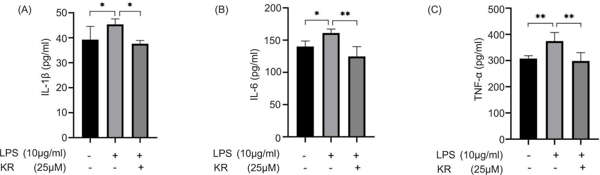 Levels of IL-1β, IL-6, and TNF-α were increased significantly in the model group, compared to the control group (p < 0.05 and <0.01). KR could reverse the elevated levels of IL-1β, IL-6, and TNF-α (p < 0.05 and <0.01) (Figure 4). KR could inhibit the overexpression of inflammatory cytokines.