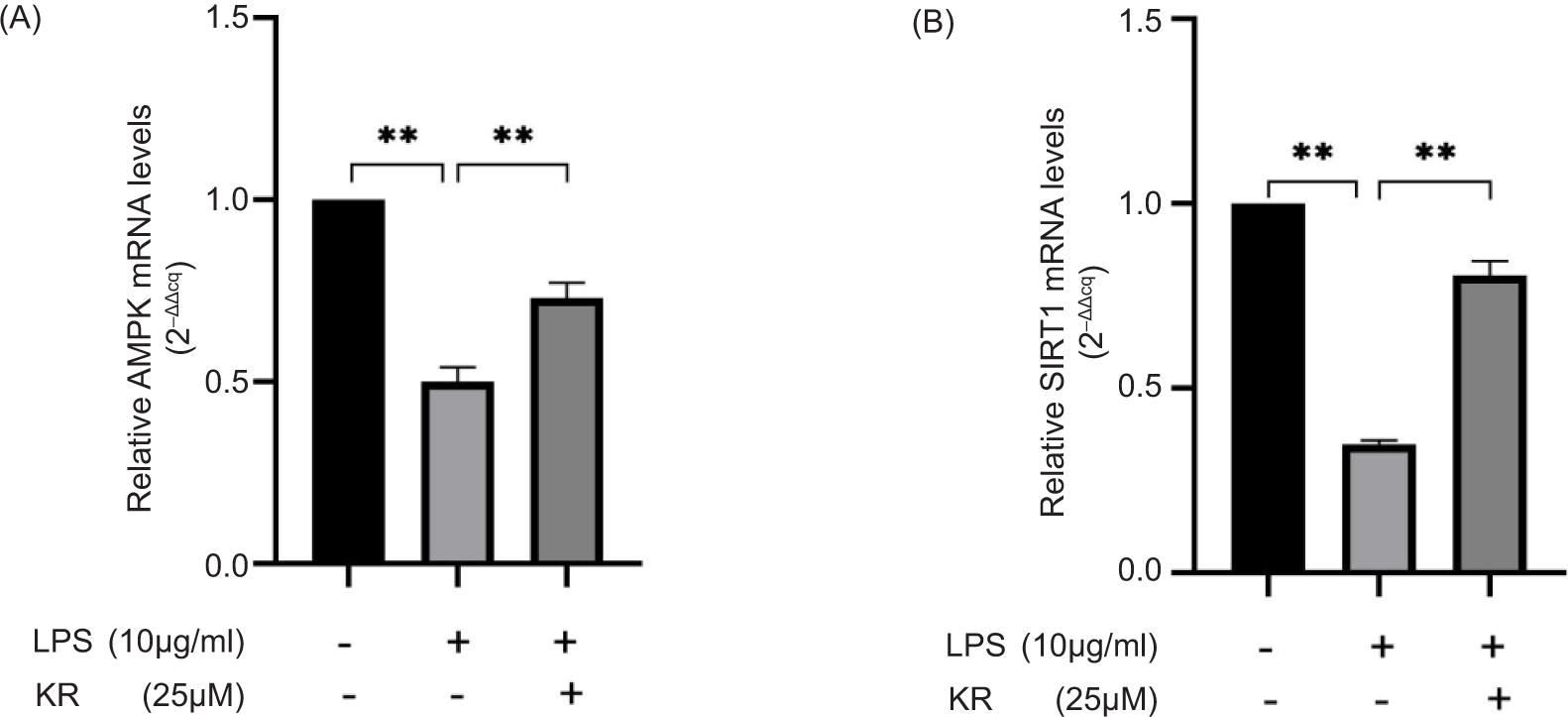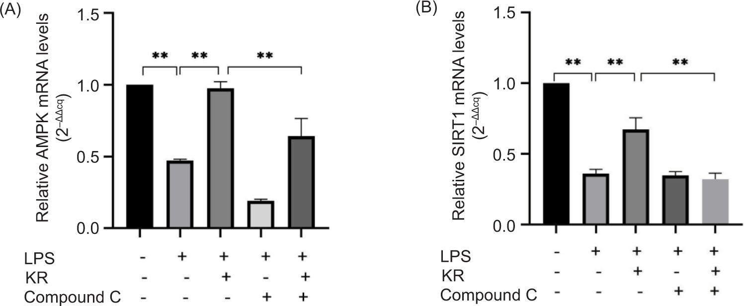 The mRNA expression levels of AMPK and SIRT1 in the model group was consistent with the protein expression. After KR treatment, the mRNA expression levels of p-AMPK and SIRT1 were increased (p < 0.01). After combined application of KR and Compound C, the effect of Compound C on mRNA expression was consistent with those of protein, both of which have the effect of resisting KR (p < 0.01) (Figure 7).
