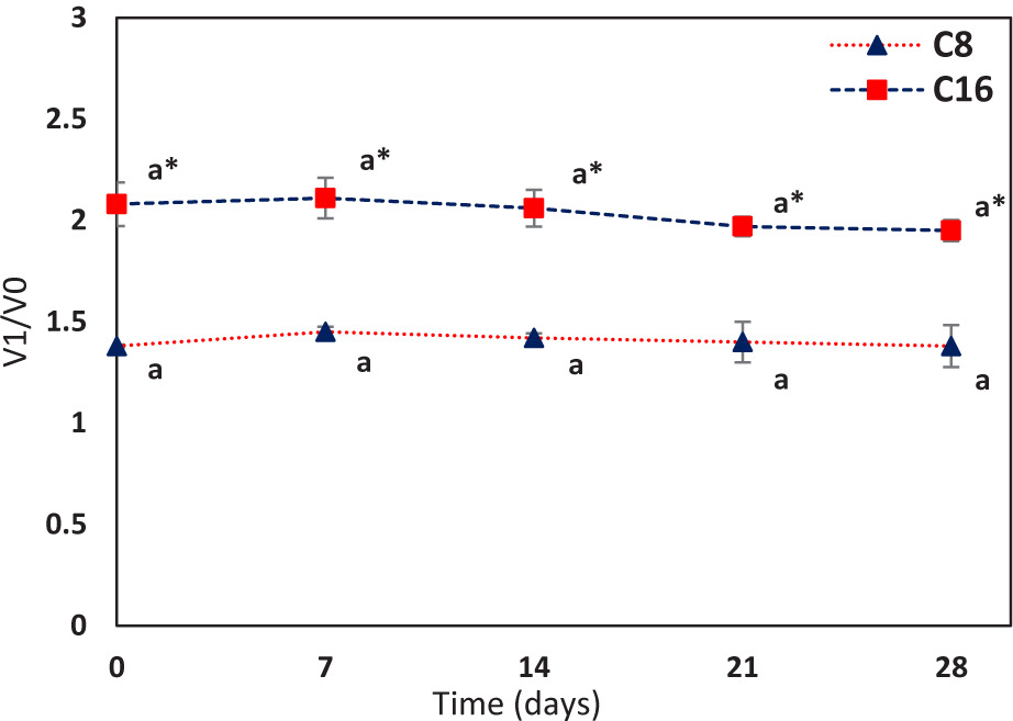 Figure 4. Evolution of Volume (V1/V0) of the dough rolls samples leavened for 8 (C8; ▲) and 16 h (C16; ■) during 28 days of storage at 2 ± 0.5°C. Each value is represented as mean ± SD (n = 3). “*” indicates statistically significant differences between samples at each storage time (P < 0.05: Student’s t-test).