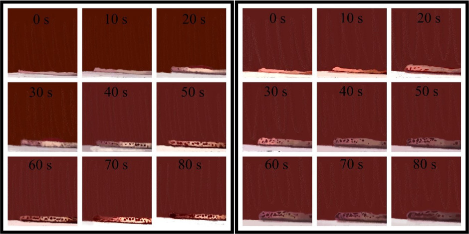 Figure 7. Cross-sectional pictures of the pizza rim of the C8 (left) and C16 (right) samples at different cooking times in the range of 0–80 s.