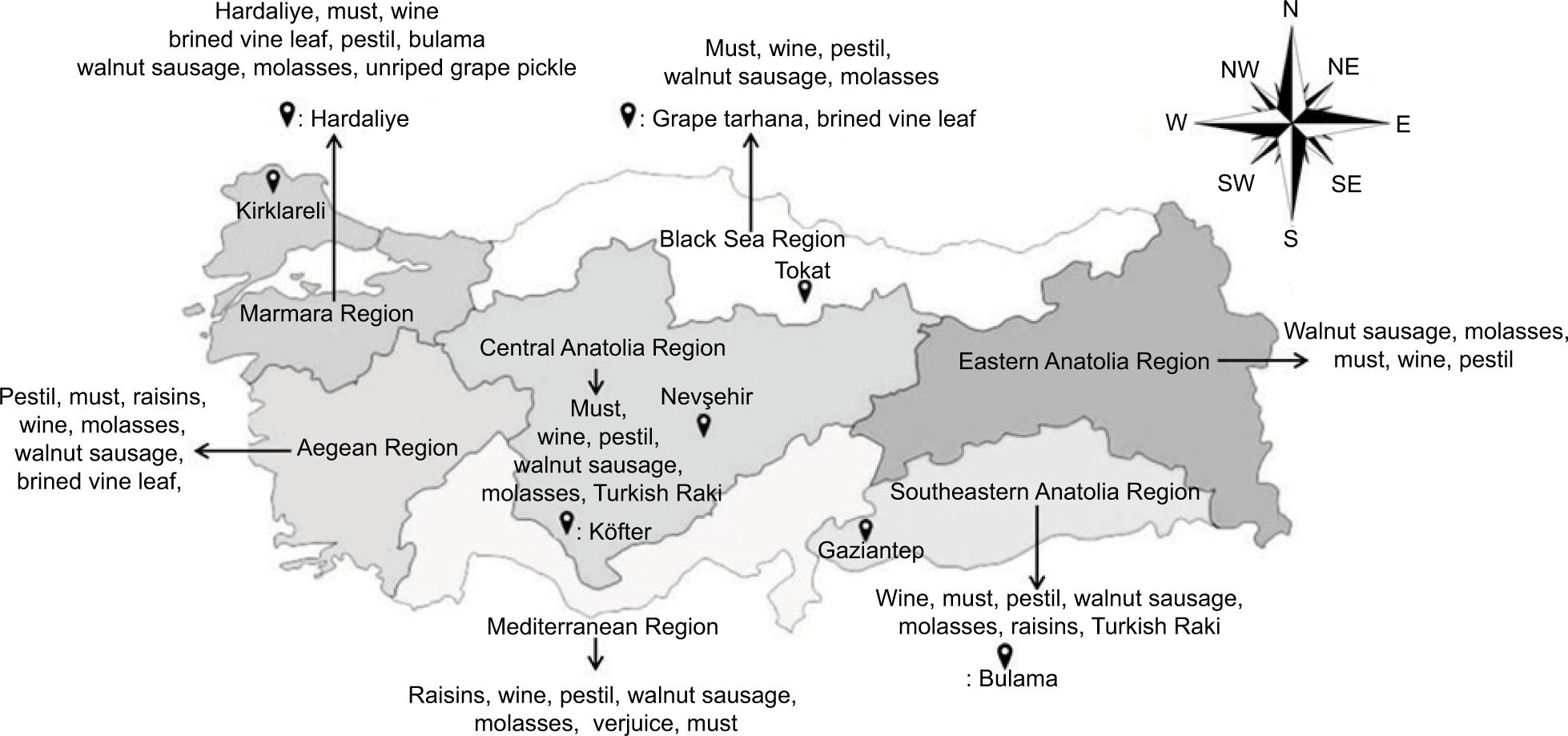 The majority of the grapes produced in Turkey are consumed fresh and sun-dried, although a small proportion is also processed into various grape-based traditional foods. The perishable nature of grapes, the shortness of the grape harvest season and the necessity of cold storage requirements have effectively led to the popularity of grape-based traditional foods. The processing of grapes into traditional foods not only extends their shelf life but also adds several sensory and health-enhancing properties to the foods (Nakilcioğlu-Taş et al., 2018; Tamer et al., 2019). A few examples of these grape-based food products are must, hardaliye, wine, molasses, tarhana and pickles (Bayram et al., 2015; Cangi and Yağcı, 2012). The production of these traditional foods may or may not include the fermentation process. The production regions for certain grape-based traditional foods in Turkey are depicted in Figure 1.
