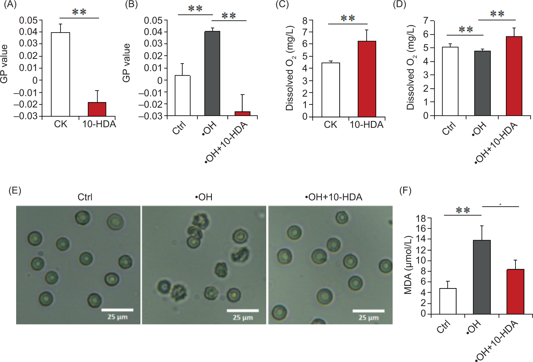 Figure 1. 10-HDA increases the erythrocyte membrane fluidity and the dissolved O2 level of erythrocyte suspension. (A) shows the GP value variation of erythrocytes with 10-HDA addition compared to that of the CKs (n=4, **p < 0.01). (B) represents the GP value differences of control, •OH-intervened, and •OH+10-HDA erythrocytes (n=4, **p < 0.01). (C) shows the change of dissolved O2 concentration in the erythrocyte suspension after the administration of 10-HDA (n=6, **p < 0.01). (D) displays the dissolved O2 levels in control, •OH-intervened, and •OH+10-HDA erythrocyte suspensions (n=6, **p < 0.01). (E) it is the morphological comparison of control, •OH-intervened, and •OH+10-HDA erythrocytes. (F) compares the MDA productions of the three erythrocyte groups (n=3, *p < 0.05, **p < 0.01).