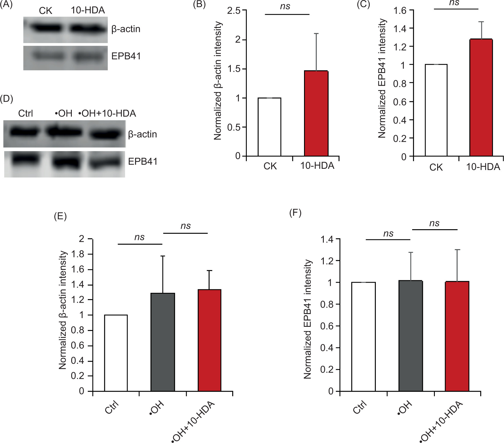Figure 2. 10-HDA does not change the levels of β-actin and EPB41 in erythrocytes. (A) shows the bands of β-actin and EPB41 of CK and 10-HDA supplemented erythrocytes through Western blotting. (B–C) are the comparisons of their normalized intensities (n = 3 , ns: no significant difference, which means p > 0.05). (D) is those of control, •OH-intervened, and •OH + 10-HDA erythrocytes, while (E–F) compare their normalized intensities (n = 3 , ns: no significant difference that p > 0.05).