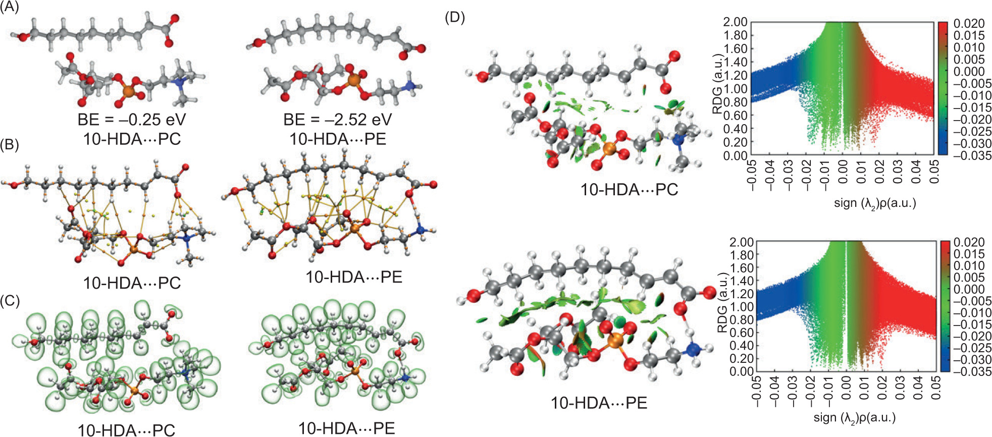 Figure 3. 10-HDA is capable of interacting with erythrocyte membranous PC and PE. (A) shows the optimized geometries for the dimer of 10-HDA•••PC and 10-HDA•••PE. The white, gray, blue, red, and orange balls denote H, C, N, O, and P atoms, respectively. The BE denotes binding energy (eV). (B) represents the molecular graph for 10-HDA•••PC and 10-HDA•••PE by QTAIM. The orange, yellow, and green balls are bond, ring, and cage critical points, respectively, and the yellow and orange lines are bond paths. (C) displays the ELF plots for 10-HDA•••PC and 10-HDA•••PE, respectively. The ELF isovalue is 0.85. The transparent green regions denote the electron localization regions that may be the bonding and lone pairs. (D) includes the RDG plots for 10-HDA•••PC and 10-HDA•••PE, respectively. The RDG isovalue is 0.05; ρ and sign (λ2) are electron density and the sign of the second largest eigenvalue of electron density Hessian matrix. All units are a.u.