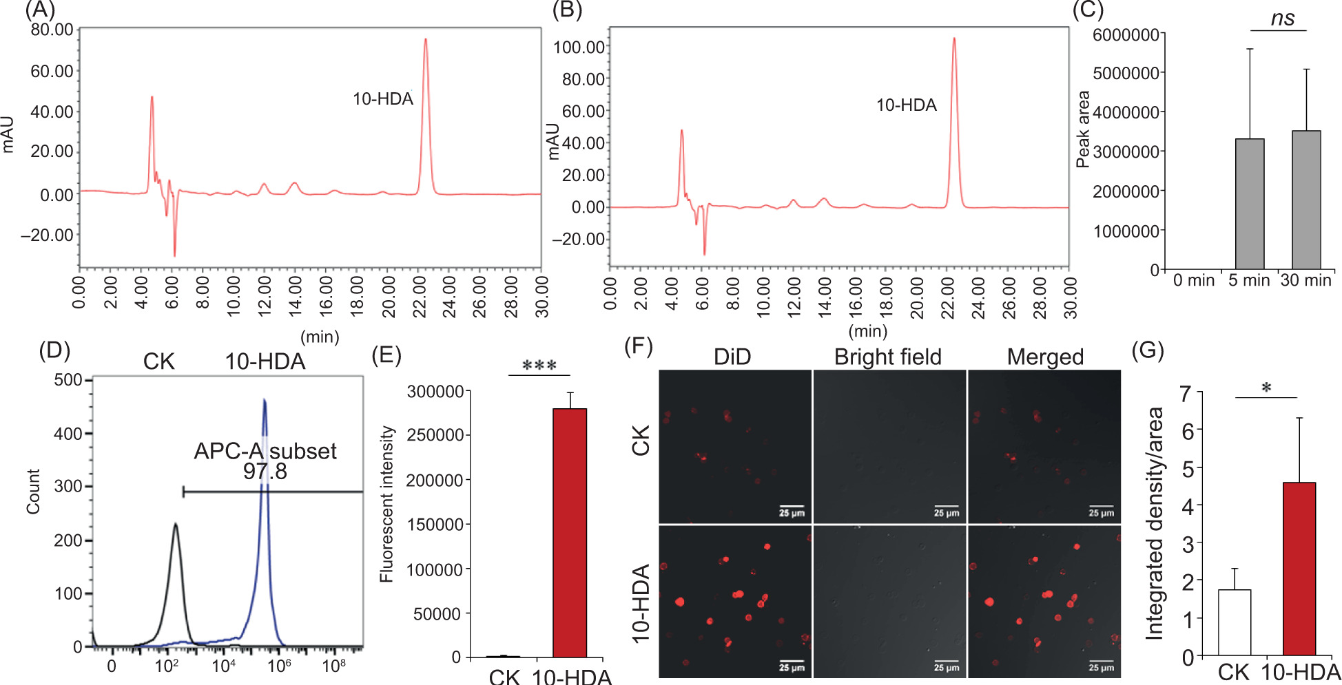 Figure 4. 10-HDA can be incorporated into erythrocyte membrane. (A–B) show the 10-HDA peaks in the HPLC graphs for erythrocyte lysates, in which 10-HDA was pre-added in the erythrocyte suspension for 5 min and 30 min, respectively. The non-specific peak and troughs between 4 min and 8 min might be the interferents from erythrocyte components. (C) is the comparison of 10-HDA peak areas between erythrocytes after 5 min and 30 min treatment by 10-HDA (n = 3 , ns: no significant difference that p > 0.05). (D) is the flow cytometric diagram to represent the difference of fluorescent intensities between CK and 10-HDA treated erythrocytes with DiD staining, which are represented by the black and the blue curves, respectively. (E) shows the fluorescent intensities of the two groups in the flow cytometric analysis (n = 4, ***p < 0.001). (F) is the comparison of fluorescent intensities between CK and 10-HDA-treated erythrocytes visualized by LSCM after DiD probing, and (G) compares the integrated density/area values measured by ImageJ software of the two groups (n = 4, *p < 0.05).