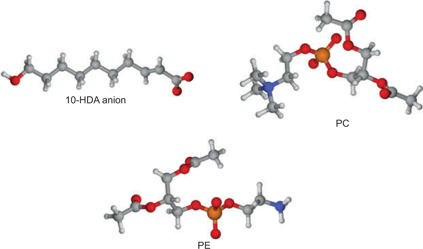 The dimer between 10-HDA anion and PC or PE (to simplify the calculation, -CH3 represented the alkane chains) molecules was studied by density functional theory (DFT), where all molecules were optimized by the Lee-Yang-Parr gradient-corrected correlation (B3LYP) hybrid functional (Becke 1993; Lee et al., 1988) method and def2-SVP (Weigend 2006) basis set with Grimme’s DFT-D3(BJ) empirical dispersion correction (Grimme et al., 2011) via Gaussian 09 package. Harmonic vibrational frequency was performed at the same level to guarantee no imaginary frequency in these molecules, i.e., they locate on the minima of the potential energy surface. Ethanol was regarded as the implicit solvent with the solvation model based on the density (SMD) model (Marenich et al., 2009) in the above calculations. The binding energy (BE) for dimers was evaluated as BE = E(dimer) – E(10-HDA)-E(PC/PE). In addition, the BE values were calculated again in water condition but not ethanol. The quantum theory of atoms in molecules (QTAIM) (Bader 1990), the electron localization function (ELF) (Becke and Edgecombe 1990), and the reduced density gradient (RDG) (Johnson et al., 2010) were further used to reveal the bonding for the two dimers, in which Multiwfn 3.8 (dev) (Lu and Chen 2012) was for calculating these quantities whose input files were extracted from Gaussian formatted checkpoint files and plotted by VMD 1.9.3 (Humphrey et al., 1996).