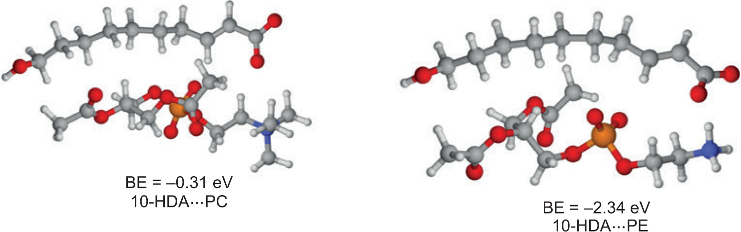 As is a molecule carrying -C=C- and -OH; 10-HDA is able to increase the membrane fluidity, and to boost the release of O2 from erythrocytes, which will be useful for improving the membrane fluidity–related diseases, as well as the hypoxia. Such bio-activity of 10-HDA may be profited from its interaction with PC and PE of the membrane. Therefore, our current work would be contributive to the utilization of 10-HDA in nutritional and pharmacological fields. Next, we will seek more evidences about the interaction between 10-HDA and PC/PE in the molecular level, and such effect in vivo.