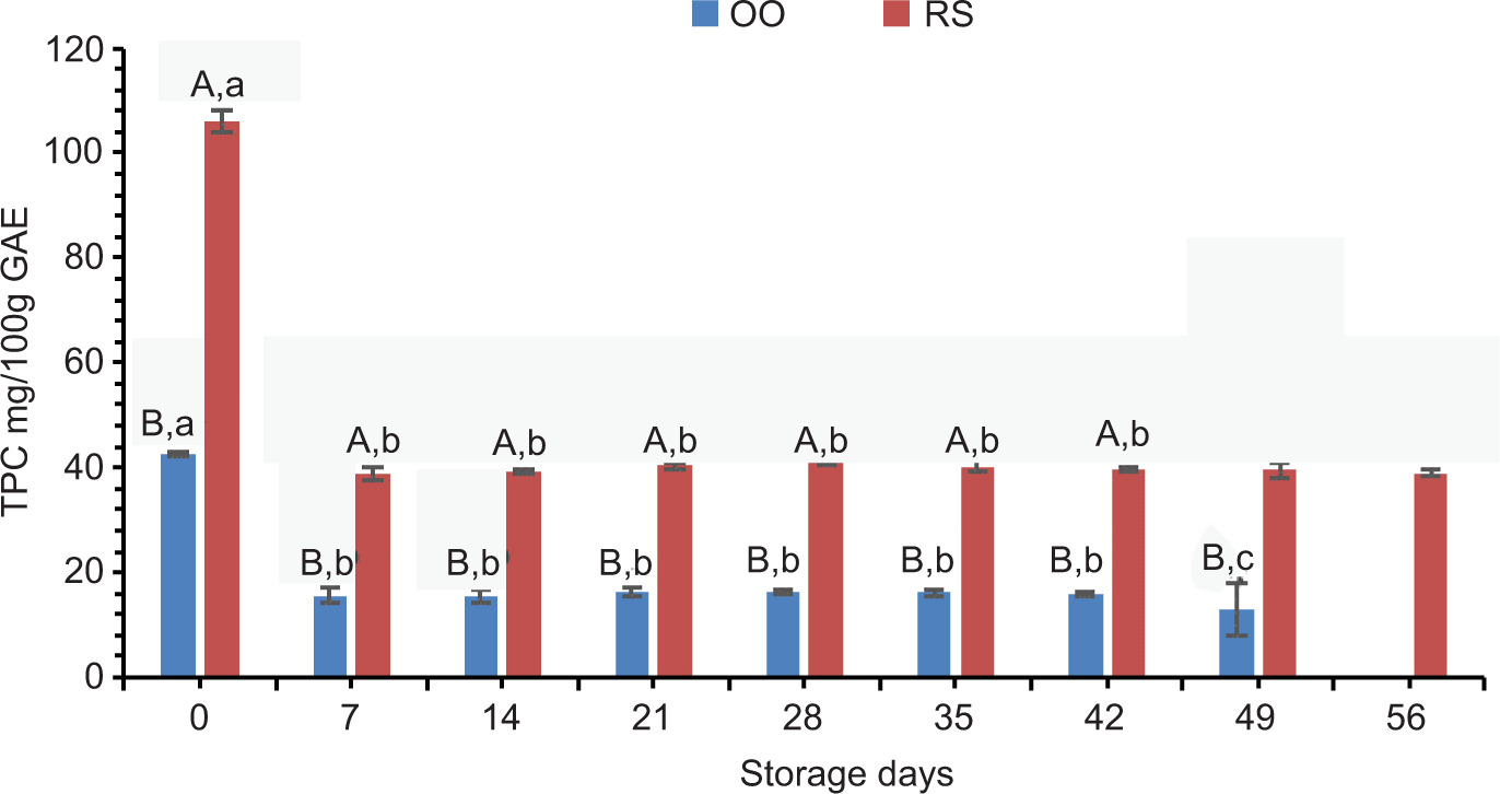Figure 1. Changes in the total phenolic content of anchovy marinades preserved in rosehip sauce and olive oil. Values labeled with upper letters are significantly different (p < 0.05) between groups, and those labeled with lower letters are significantly different (p < 0.05) between days (OO: olive oil; RS: rosehip sauce).
