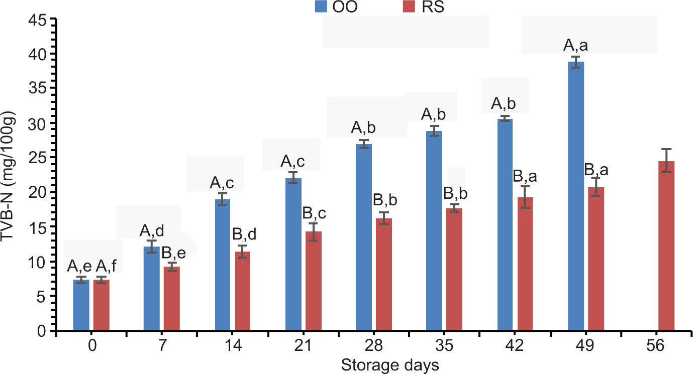 Figure 2. Changes in TVB-N values of anchovy marinades preserved in rosehip sauce and olive oil. Values labeled with upper letters are significantly different (p < 0.05) between groups, and those labeled with lower letters are significantly different (p < 0.05) between days (OO: olive oil; RS: rosehip sauce).