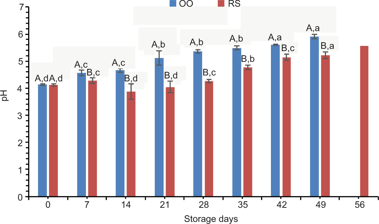 Figure 3. Changes in pH values of anchovy marinades preserved in rosehip sauce and olive oil. Values labeled with upper letters are significantly different (p < 0.05) between groups, and those labeled with lower letters are significantly different (p < 0.05) between days (OO: olive oil; RS: rosehip sauce).