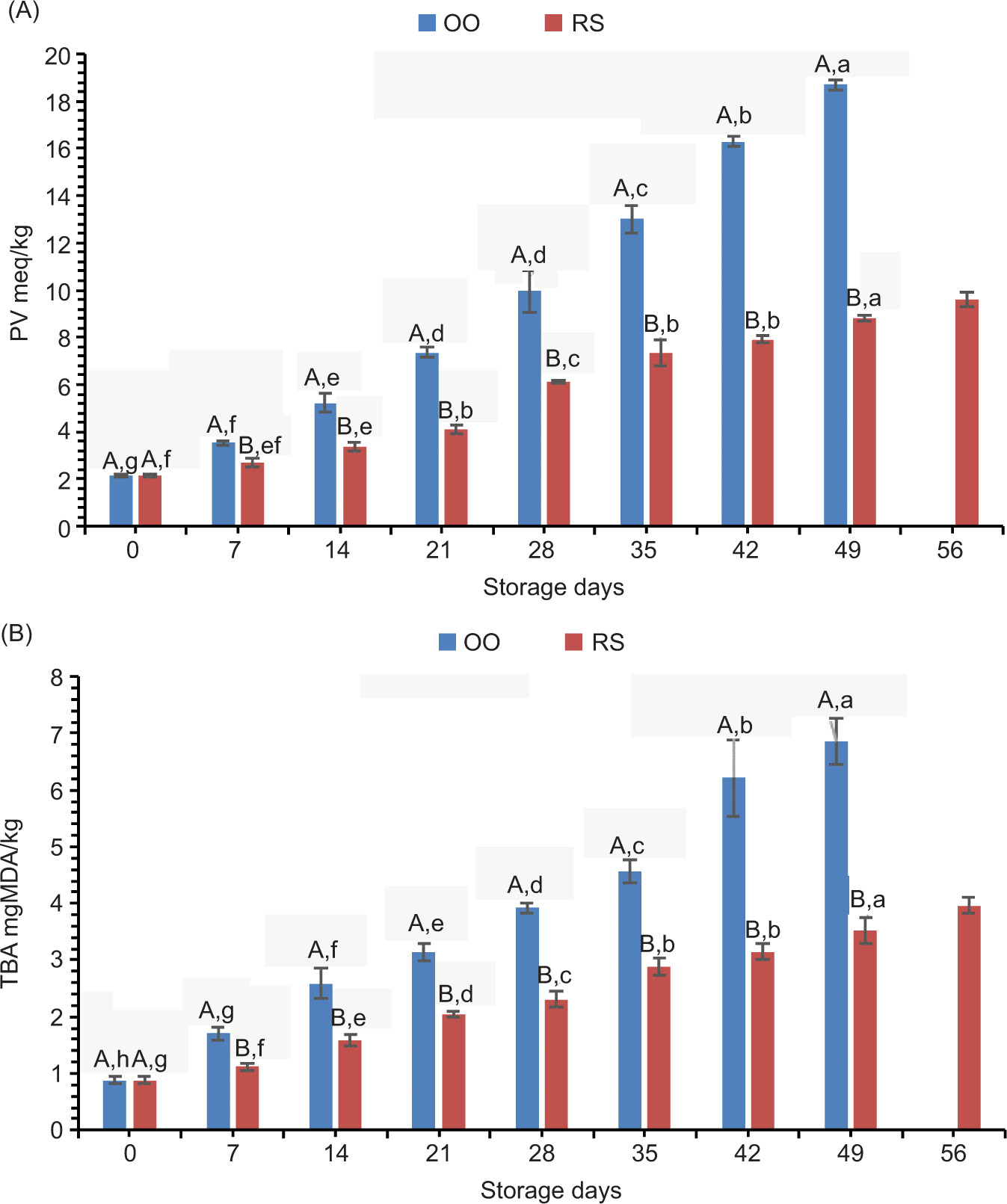 Figure 4. Changes in PV and TBA values of marinated anchovy fillets treated with olive oil–rosehip sauces during refrigerated storage at 4°C. Values labeled with upper letters are significantly different (p < 0.05) between groups, and those labeled with lower letters are significantly different (p < 0.05) between days (OO: olive oil; RS: rosehip sauce).