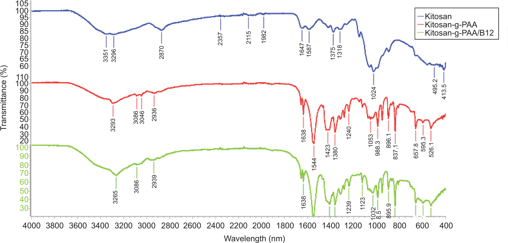 Fourier-transform infrared (FT-IR) spectroscopy was used for determining the functional groups that helped define the surface chemistry, chemical properties of the synthesized biopolymer. The FT-IR spectrum of chitosan, chitosan–grafted PAA, and vitamin B12- loaded chitosan–grafted PAA were shown in Figure 2.