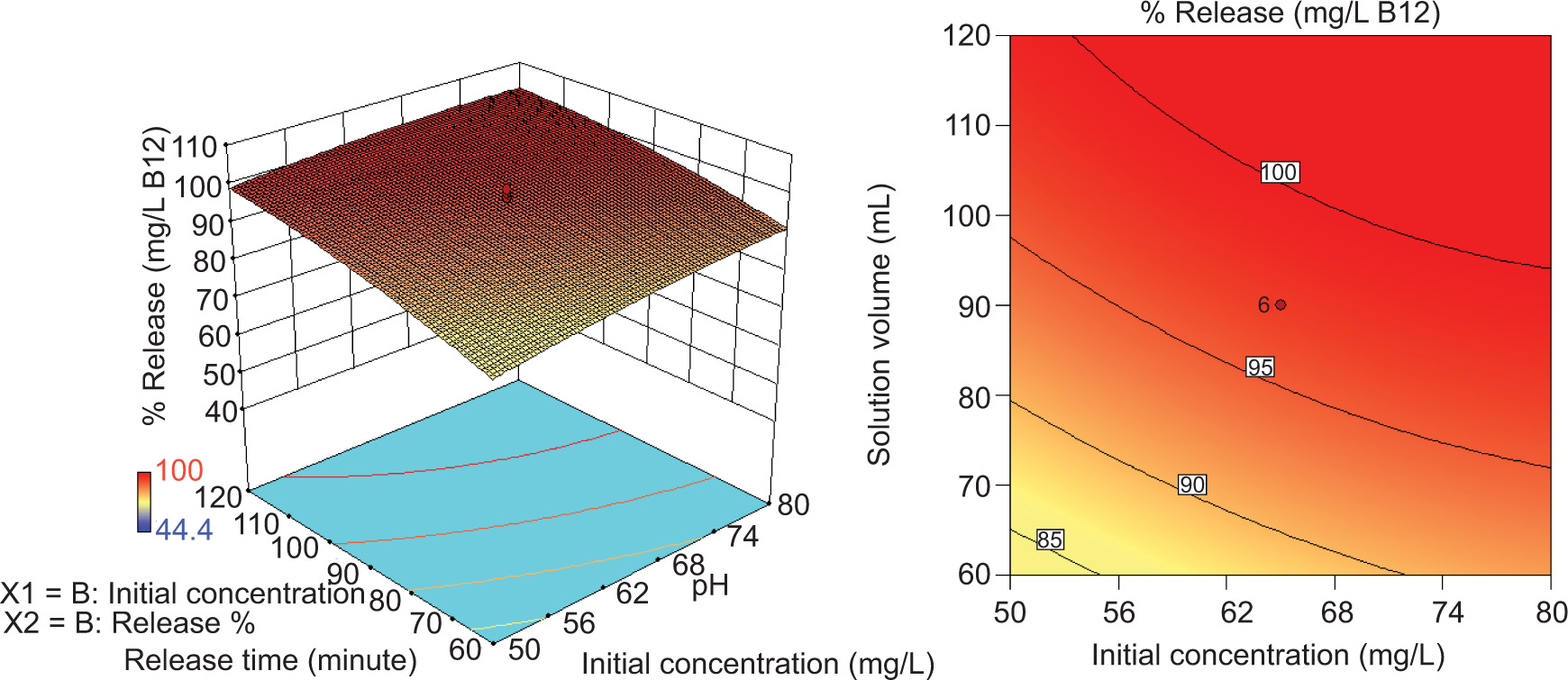 Figure 12. Effect of interaction between solution volume and initial concentration on vitamin B12 release efficiency: (A) 3D graph and (B) 2D graph.