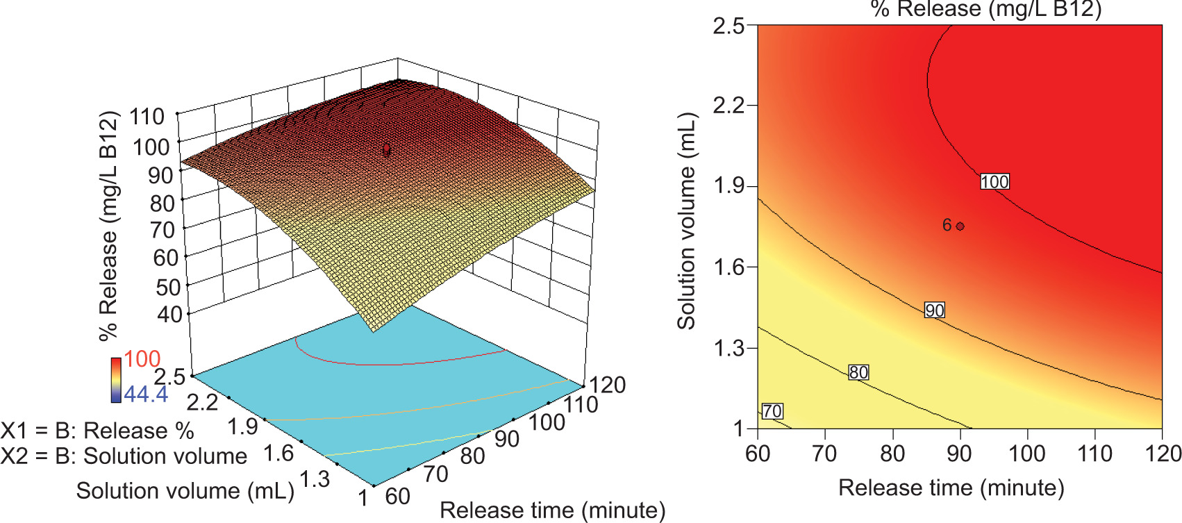 Figure 13. Effect of interaction between solution volume and release time on vitamin B12 release efficiency: (A) 3D graph and (B) 2D graph.