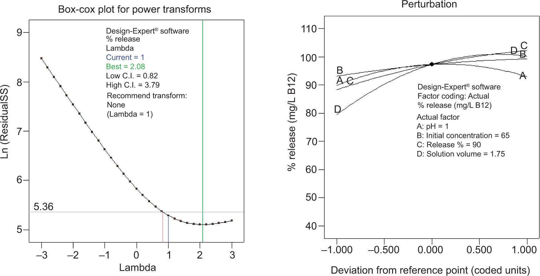 A perturbation graph (Figure 14B) was drawn to compare the influence of all factors on the optimum conditions for the release of vitamin B12 release from biopolymers. The graph was also used to analyze the variations in factors as well as the combined effect of all factors on a process. In addition, a power conversion plot for vitamin B12 release was obtained to control λ value. The power conversion plot is often a preferred diagnostic plot drawn to estimate any necessary conversion of the experimental value to increase the significance of the model. As discovered from the power conversion graph, it was model that there was no need for any conversion according to the obtained λ value, that is, λ = 1.