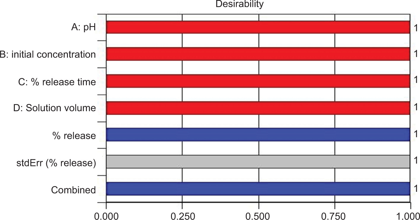 A CCD, which is a statistical approach, combined with the response surface methodology (RSM), is a suitable system for optimizing the levels of parameters that affect release of drug in the experimental study. This method is a useful method for analyzing the effects of some independent variables on RSM along with a set of statistical and mathematical data. In addition, various estimations and tests, such as estimation and testing of the regression equation with the CCD technique, the factor effect testing, model determination coefficient calculation, optimal level combination estimation, and response surface properties around it, are provided. The CCD is known as a regression analysis and is used to estimate parameters and establish relationships between test indices and periodic variables. The experimental design approach is particularly suitable for optimizing complex synergies or antagonistic effects between variable states (Ince and Ince, 2019). In this study, a CCD containing four and five levels of each of these factors was chosen to examine and optimize the effect of the selected variables. A CCD experiment design (Table 1) was created to measure the effect of each variable, namely pH (X1), initial concentration (X2), release time (X3), and solution volume (X4), on drug release. Variable levels were coded as -1, 0, and +1, respectively, and were defined as low, medium, and high variables. Also, +2 and -2 star points were defined for each experimental group, corresponding to +α and -α, respectively. The effects of main, interaction, and quadratic variables were modelled using CCD. This experimental design was carried out to minimize the effects of uncontrollable parameters and was based on controllable factors. In addition, for optimizing the process parameters, their interactions were performed using a CCD with a minimum number of experiments. The CCD design in question included the ranges of the independent variables that were preferred in the experimental study and that had an effect on adsorption, and the responses corresponding to these variables (Table 2).