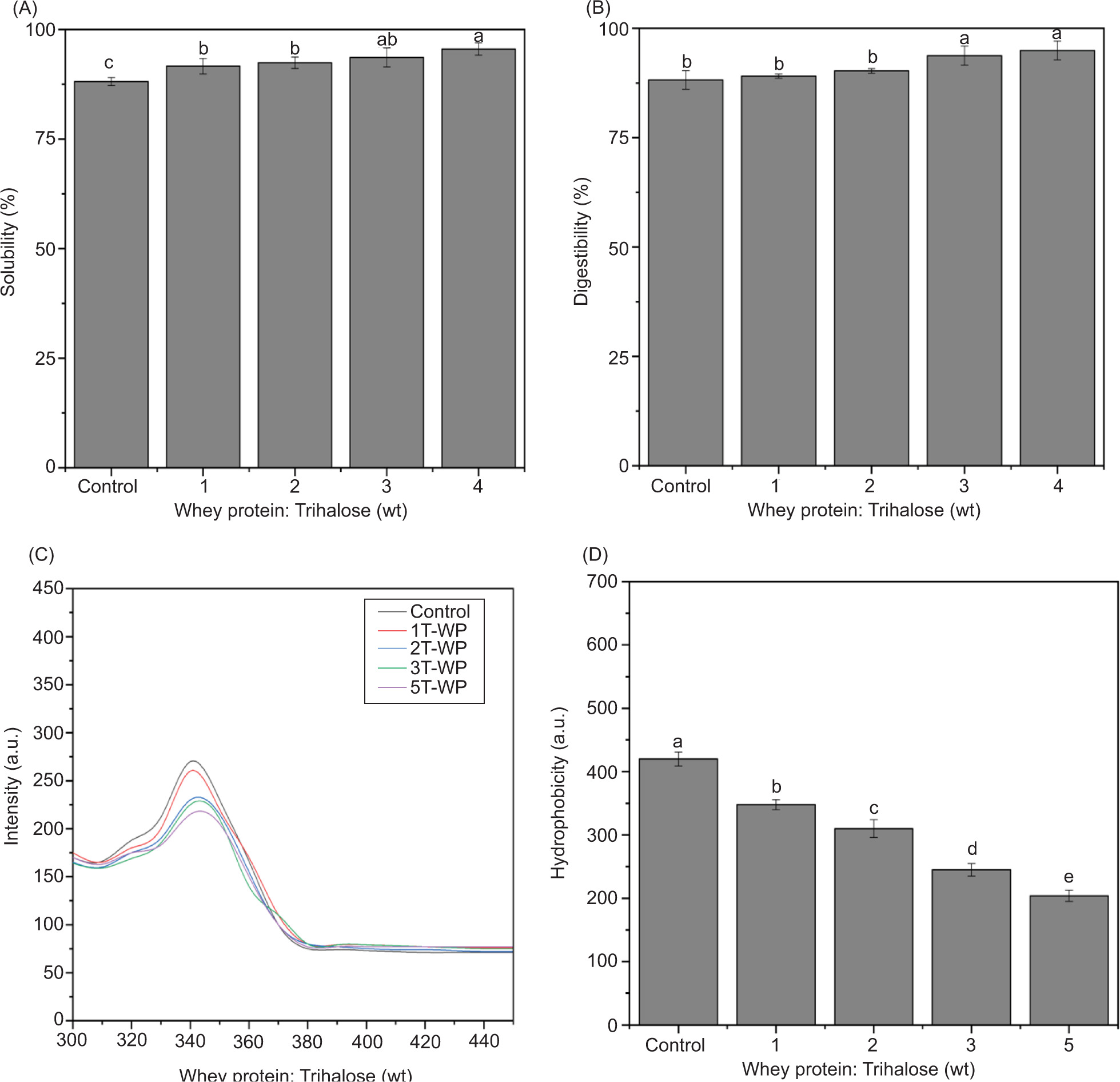 Figure 1. Changes in (A) average water solubility, (B) protein digestibility, (C) fluorescence intensity, and (D) UV absorbance of trehalose-whey protein conjugates (T-WPs). Control (0T-WP) represents the absence of trehalose, while 1T-WP, 2T-WP, 3T-WP, and 5T-WP represent trehalose conjugation with WPs at 1%, 2%, 3%, and 5% (w/v) concentration of trehalose, respectively. Different lowercase letters represent significant differences (p < 0.05).