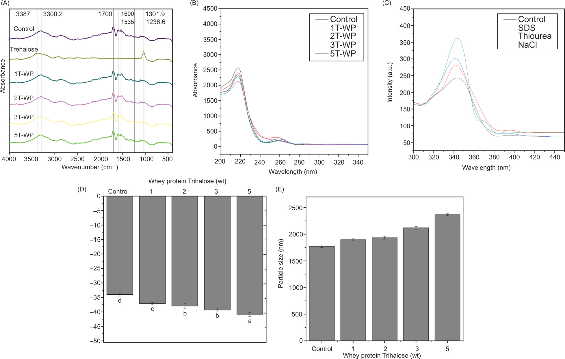 Figure 2. Changes in (A) FTIR absorbance, (B) fluorescence intensity (molecular forces), (C) surface charge, (D) surface hydrophobicity, and (E) particle size of trehalose–whey protein conjugates (T-WPs). Control (0T-WP) represents the absence of trehalose, while 1T-WP, 2T-WP, 3T-WP, and 5T-WP represent trehalose conjugation with WPs at 1%, 2%, 3%, and 5% (w/v) concentration of trehalose, respectively. Different lowercase letters represent significant differences (p < 0.05).