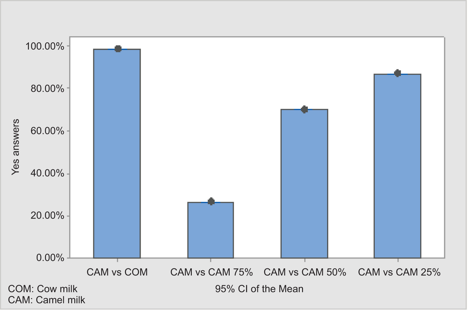 The graph in Figure 1 displays the consumers’ responses interval with a 95% level of confidence (CI) for the mean (p value of 0.05) of those who were able to distinguish between cow’s milk and camel’s milk. As can be seen, the obtained data illustrates a notable contrast in the testers’ responses.