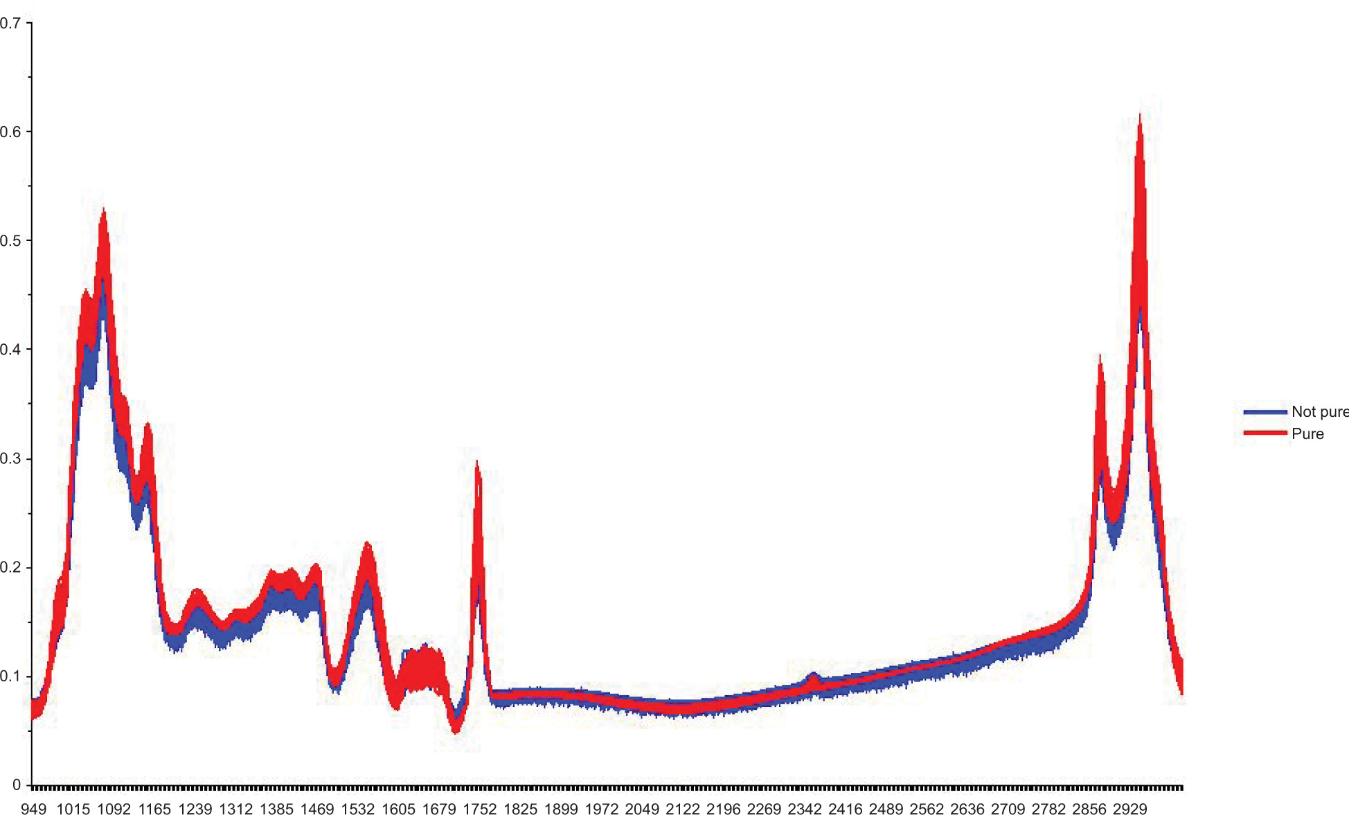 By using HC analysis and PC analysis techniques on the MIR spectra of camel’s milk, it was feasible to differentiate between pure and adulterated samples. This strong distinction lies in the spectral difference between the two studied types of milk, as revealed in Figure 2, which shows that there are noticeable differences in the spectral intensity of multiple bands.