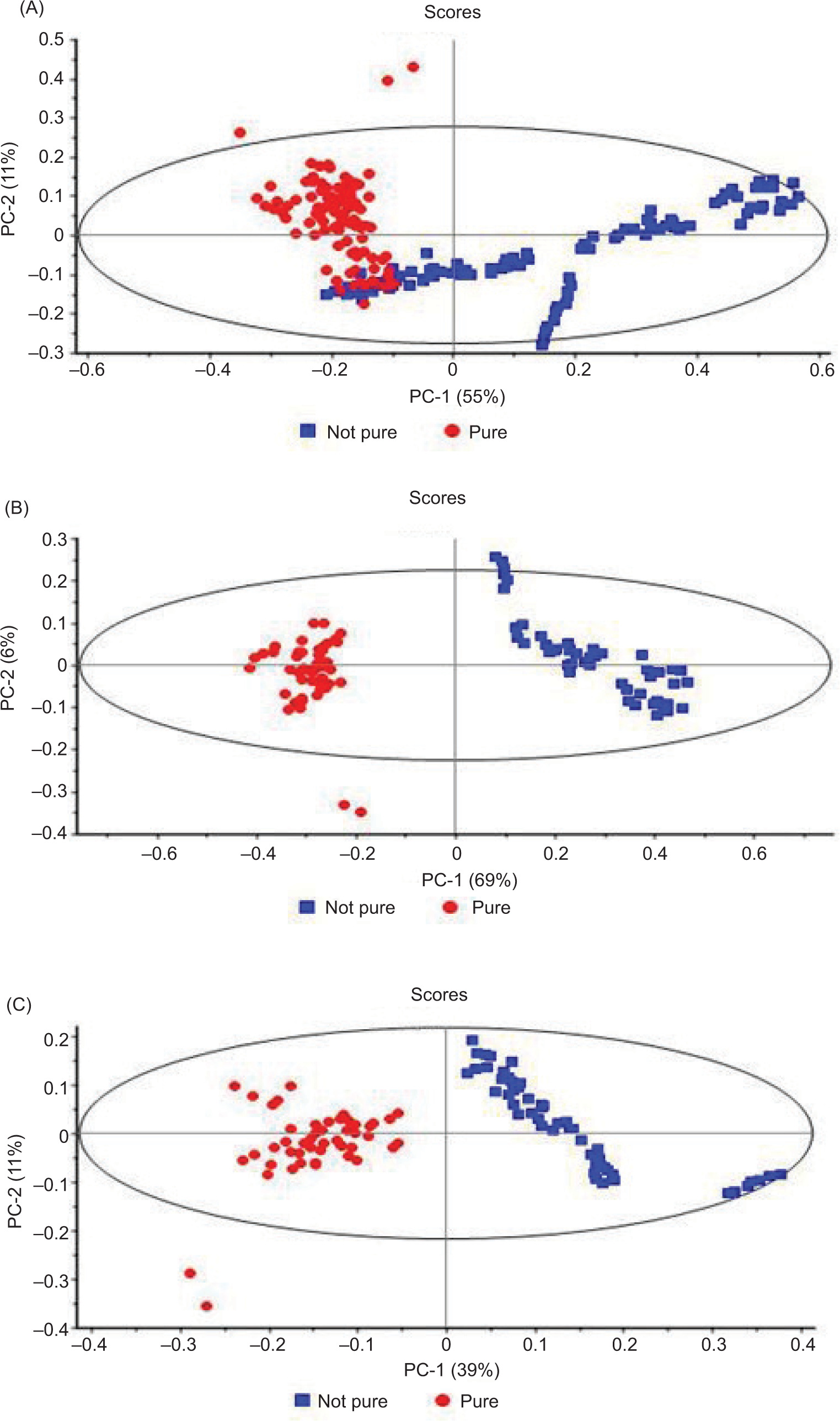 Figure 3. Scores graphs of PC analysis for all the studied samples of pure and adulterated camel’s milk (A), pure camel’s milk with 1–50% adulteration (B), pure camel’s milk and 50–99% adulteration (C).