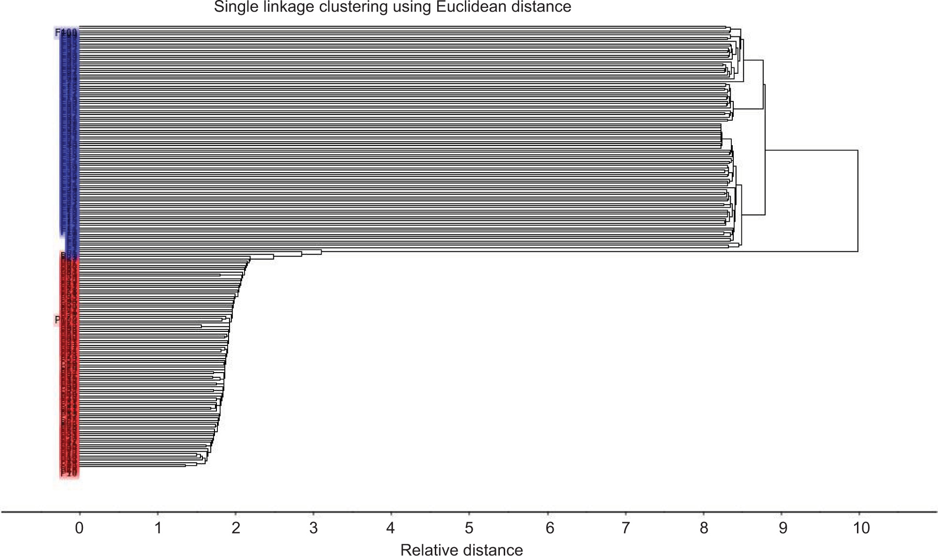 Figure 4. Dendrogram created using HC analysis with single linkage and the squared Euclidean distance to compare adulterated and nonadulterated camel’s milk samples.